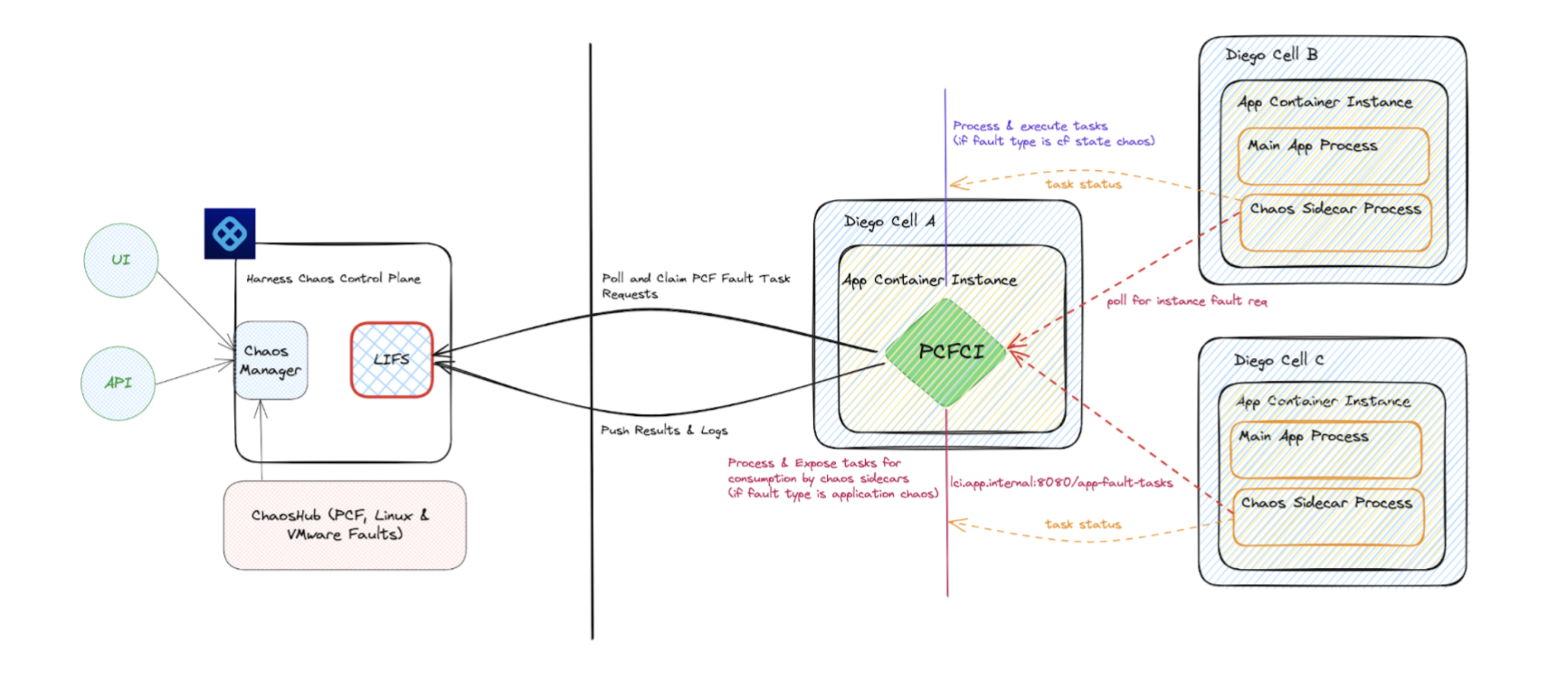 The second component runs as a sidecar process in the app instance that queries the first component for any task directed towards its own app instance ID/container, fetches the task and injects the chaos.