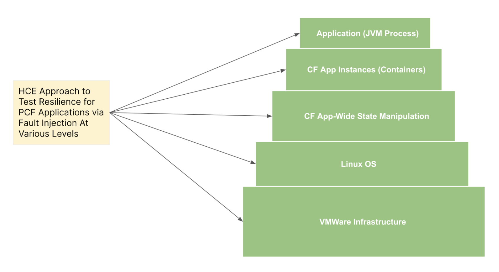 You can use HCE to test the resilience of your CF-based microservices by executing chaos experiments on various layers of CF, ranging from application processes (supported for JVM-based apps currently) to the underlying host (VMware) infrastructure. HCE supports resilience probes which facilitates: