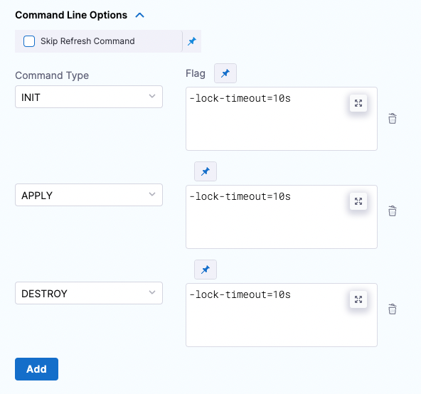 This setting allows you to set the Terraform CLI options for Terraform commands depending on the Terraform step type. For example: -lock=false