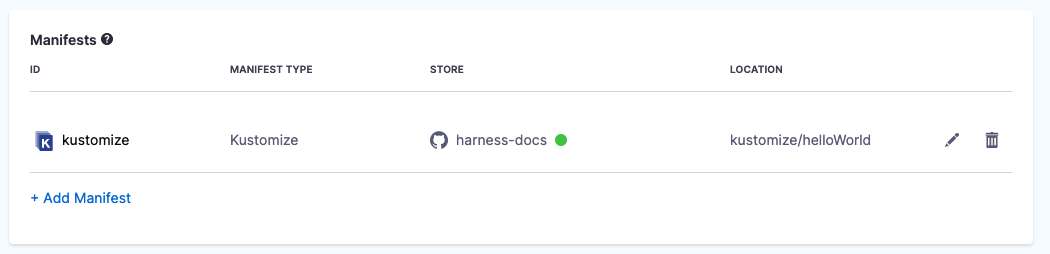 In the Harness Service that uses the Kustomization and plugin, in Manifests, select the existing Kustomize manifest or click Add Manifest and add a new as described in Add Manifests and Kustomization above.
