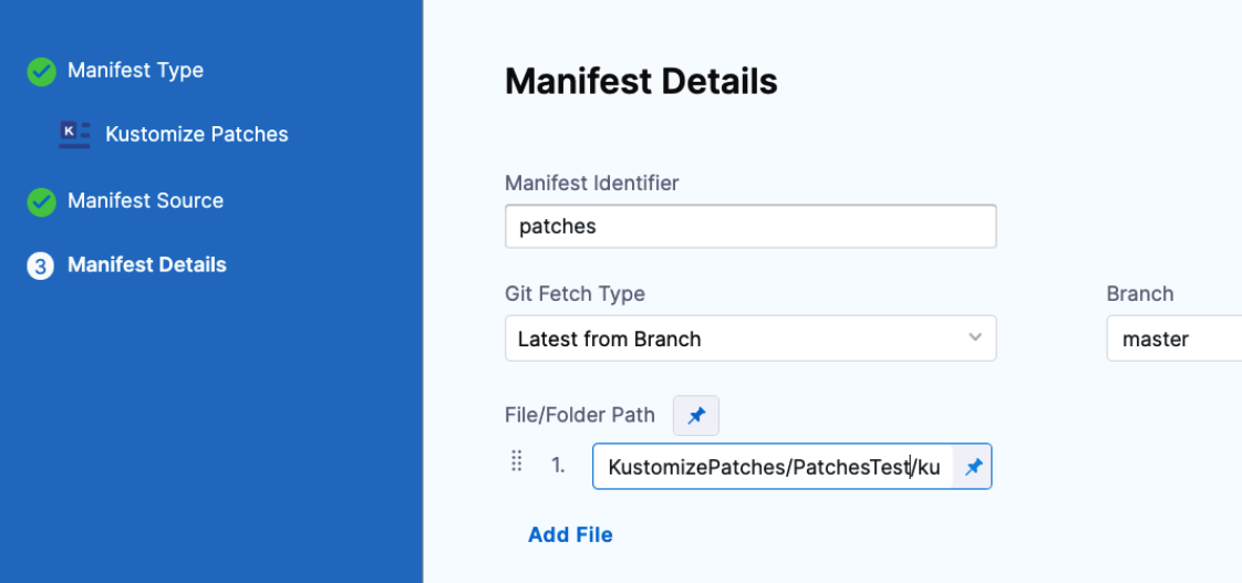 In Manifests, click Add Manifest. Go to Kustomize Patches for more information.