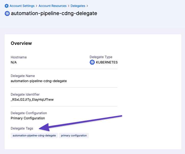 The Delegate Selector setting lists the Delegate Tags for all Delegates. You can see these Tags by looking at the Delegate details:
