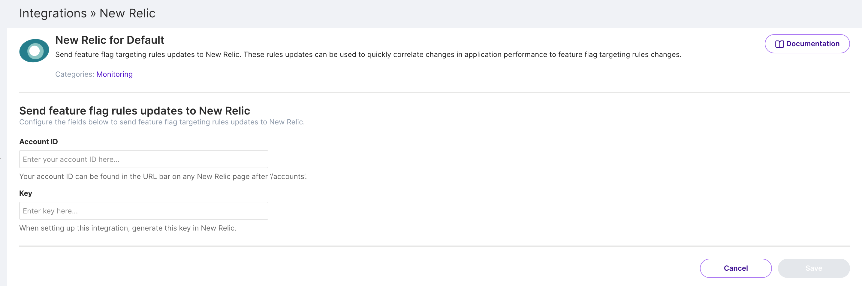 Paste the Account ID and Key you copied in step 5 of the New Relic instructions.