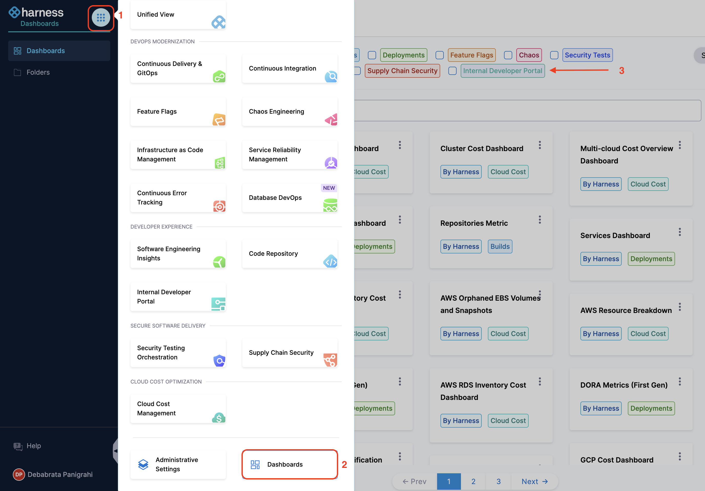 To view and access dashboards, select DASHBOARDS from the left navigation in your Harness account. You can filter the data on the dashboards for IDP module by selecting the module name from the top of the page.