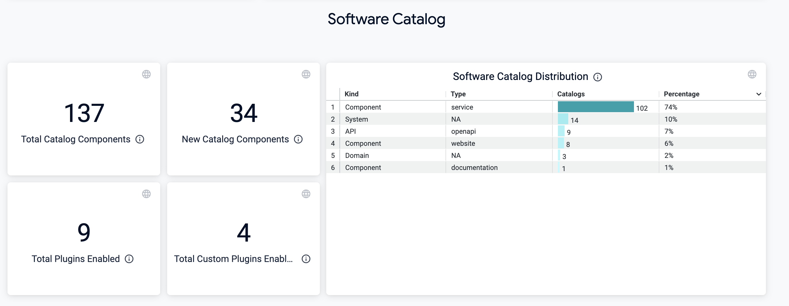 - Dashboard describing the state of catalog, which includes, Number of registered entities, catalog kind and type.