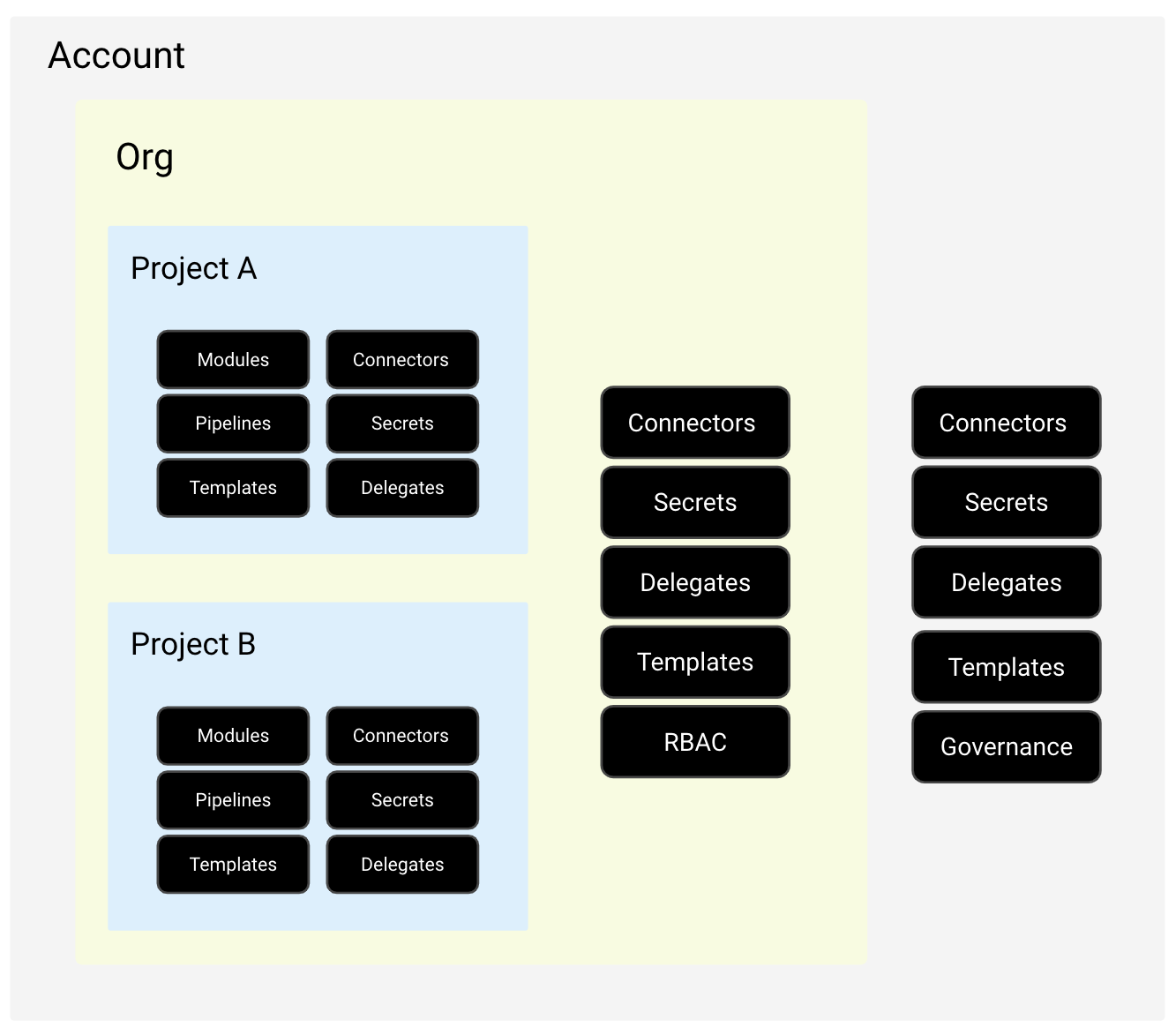 Your Harness account is the entity at the highest scope. It contains organizations and projects as well as global settings and resources.
