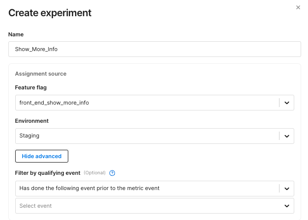 You can set this filter during experiment creation, and it is applied globally across all key, guardrail, and supporting metrics. These filters are additive, meaning if a metric already includes a qualifying event, the experiment's entry filter is applied first, and both must be satisfied.